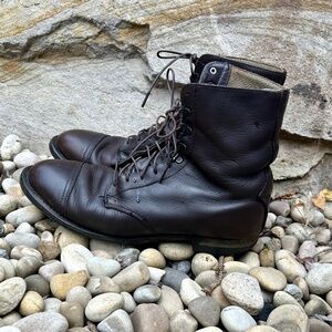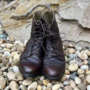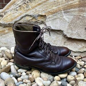 These Ariat Brown Leather Paddock Boots, size 10, are the ideal footwear for the riding and the working at the stable. The brown leather is supple and broken in, sparing their new owner from breaking them in. The soles are in very good condition and the laces are brand new. These boots have a lot of life left in them!