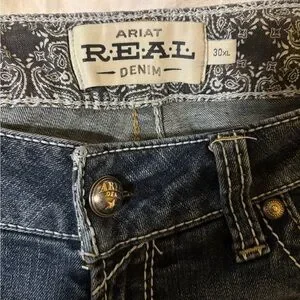 Stylish boot cut jeans by Ariat. Dark blue hue. Perfect for casual wear. Inseam - xtra long