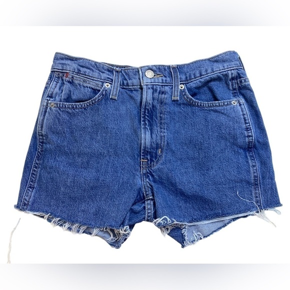 These are slim-fit, mid-rise cut-off shorts with a raw hem. They're made with a 100% cotton fabric that wears better with time. This version comes in an authentic medium wash.