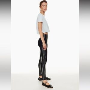 These are high-rise leggings with a wide waistband for a smooth silhouette. They’re made with our premium Stretch Vegan Leather from Japan, crafted for superior shape retention, easy care and an authentic look and feel.