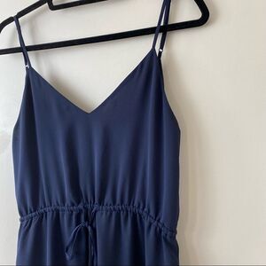 This is a sleeveless dress with a double-V neckline and a cinchable elastic waist. It's made with fluid, drapey fabric in a Navy print.