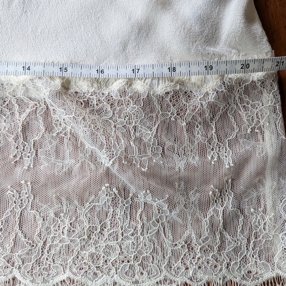 Versatile slip dress, especially for layering. The scalloped neckline, intricate lace trim, and drapey fabric make this light and pretty piece easy to work into your wardrobe. The fabric is soft and silky. Has adjustable straps.
