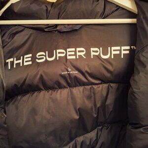 This black superpuff goes down to the hip and is engineered to deliver warmth to -20°C / -4°F. It is water-repellent and wind-resistant. It features an adjustable hood and extra sleeves with thumbholes to prevent wind from entering. Gently used and in overall good condition