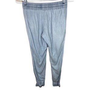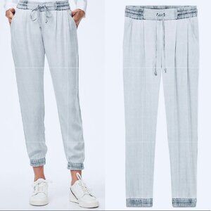 Aritzia Azure Skies Los Feliz Pants in Blue / Grey and Women's Size Small. Streamlined joggers for lazy days. These comfy joggers are made with a lightweight twill chosen for its beautiful drape. They're cut for a streamlined, flattering shape — great for the weekend. 100% rayon. Drawstring waist. Good pre-loved condition. Some minor discolouration at one of the knees - see photos.