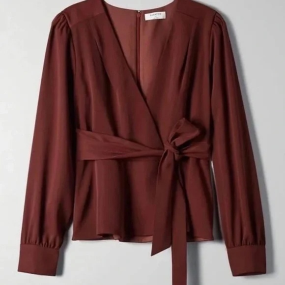 A deep v-neck, faux-wrap blouse with a tie at the waist and hidden zipper. Beautifully structured and drapey.