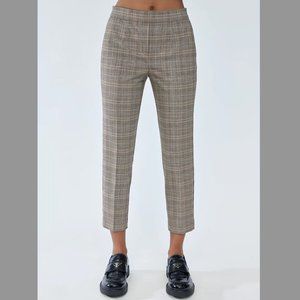 These are mid-rise, pull-on trousers with a slim leg. They're made with yarn-dyed plaid.