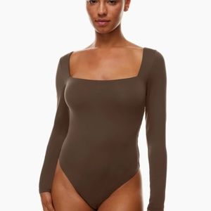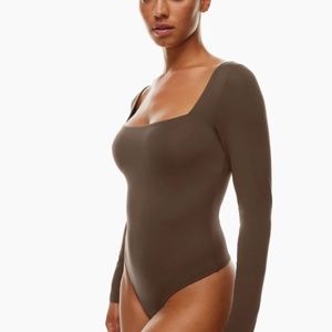 Photos & information from aritzia.com: "A cult classic for a reason. This is a squareneck longsleeve bodysuit with a thong-cut bottom and double-layer fabric for a smooth, supportive fit. It's made with Babaton's signature Contour — luxe, ultra-flattering fabric coveted for its smoothing effect and second-skin feel. Essential for every body. Hidden Hold Loops keep your bra straps in place and out of sight."