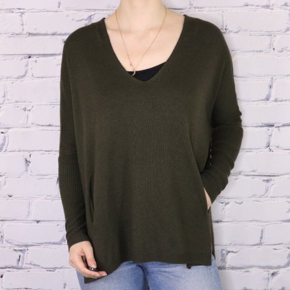 Model picture to show fit, sweater is green not brown. In amazing condition. Deep v-neck, slits on the side, bat wing. 38% wool, 20% linen, 30% viscose, 12% nylon. Tag says size XXS but I'm a size S and it fits me well, just a tad tight in the arms.