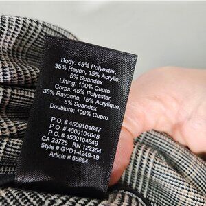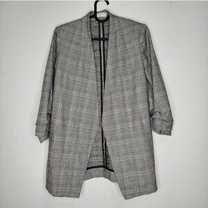 This is an open-front, shawl collar blazer with rouched and tacked sleeves. This version is made from a yarn-dyed fabric, which means the plaid is woven into the fabric.
