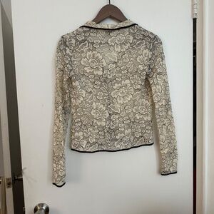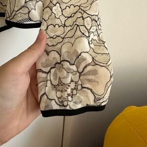 Aritzia lace shirt, beige with black lining. I wanted to wear this shirt so bad but I’m a small and this is an XS (too small for me, it fit but was tight). Would look super cute on someone else though. The label says dry clean only but I put it in cold water wash and it did fine.
