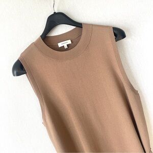 This is a sleeveless, mock-neck sweater dress with ribbed trim. A removable self belt and subtle side slits add a touch of flare to the dress.
