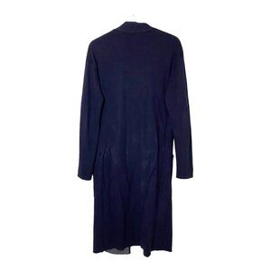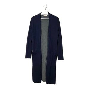 Aritzia Babaton Lance Wool Linen Blend Duster Cardigan Navy. Navy exterior and dark grey interior. Long length. Open front. Two front pockets. Materials: 37% Wool, 27% Viscose, 19% Nylon, 17% Linen. No known flaws.