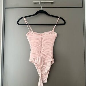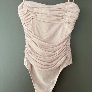 • A form-fitting one-piece bodysuit from Aritzia’s Babaton line in pink with a ruched design.