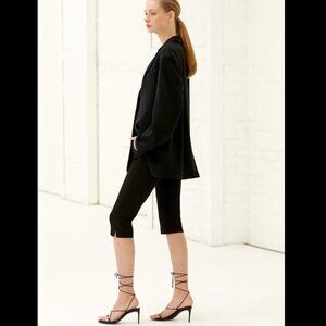 This is a menswear-inspired, capri-length short with a slim leg. It's made from a matte, drapey fabric.