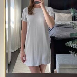 This is a t-shirt mini dress with an A-line silhouette. It's made with Terado™, an exclusive Japanese crepe that's matte crepe on the front and satin on the back.