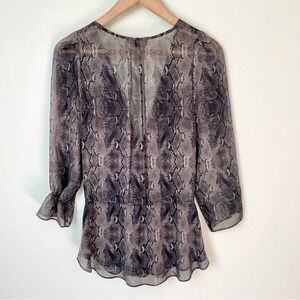 Aritzia Babaton Reptile Print Silk Blouse. Faux wrap front with elastic peplum ruffle hem. 100% silk. Super lightweight and flowy. Semi sheer. Perfect top for summer. Size medium. Excellent condition.