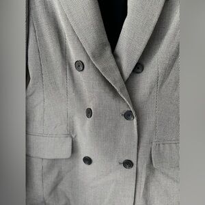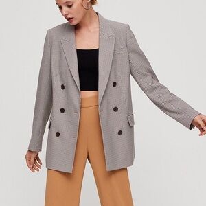 This is a double-breasted blazer with menswear-inspired tailoring. It's made from a yarn-dyed fabric, which means the plaid is woven right into the fabric.