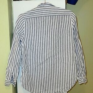 Chic navy and white striped shirt. Features a classic design with a modern twist.