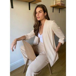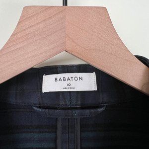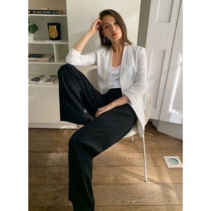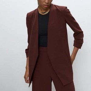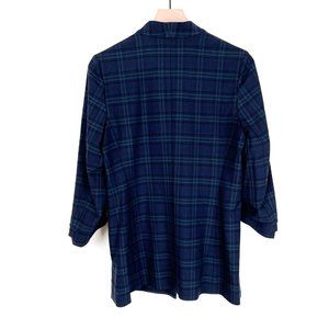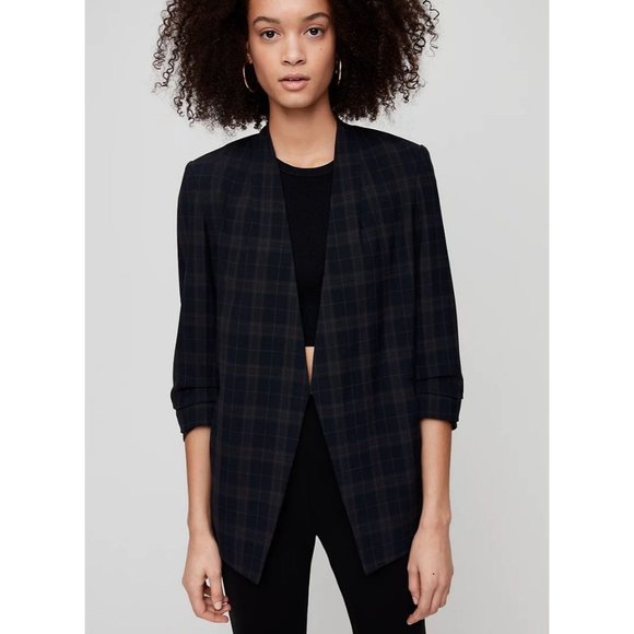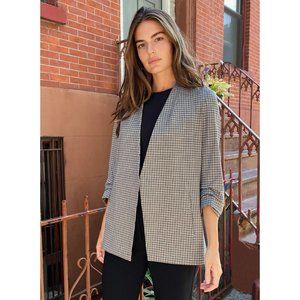 Chic black plaid blazer. Open front design. Three-quarter sleeves. Perfect for layering.