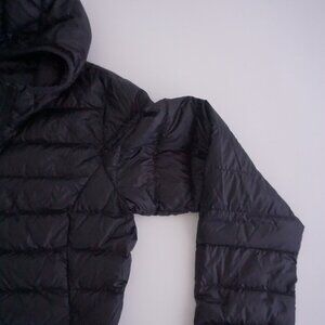 Sleek black puffer jacket. Longline design. Hooded for extra warmth. Perfect for cold weather.