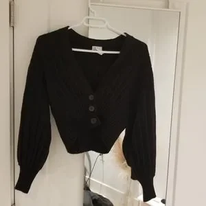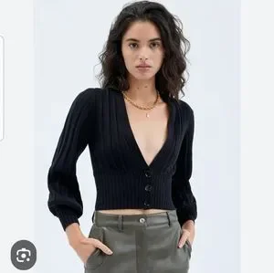 Chic black ribbed cardigan. Deep V-neck with button closure. Perfect for layering.