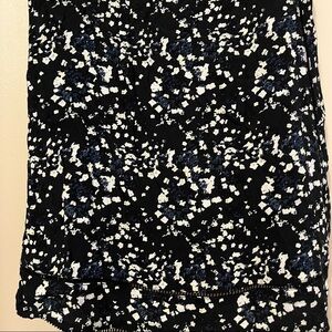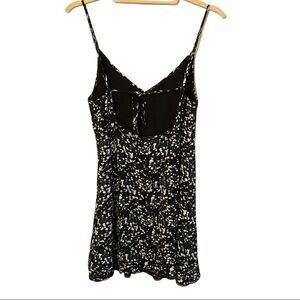Elegant black dress with white floral pattern. Spaghetti straps. Flowy silhouette.