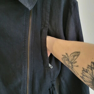 Black oversized military style jacket. Jacket is designed with a side zipper and waist tie. Pockets side and upper jacket.