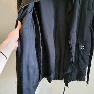 Black oversized military style jacket. Jacket is designed with a side zipper and waist tie. Pockets side and upper jacket.
