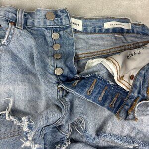 Stylish blue jean shorts. Frayed hem. Classic five-pocket design. Perfect for casual wear.