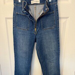 Aritzia Denim Forum The Just Peachy Straight High-waisted straight-leg jeans in the shade '70s blue. Medium to dark wash pants. Front zipper fly. 2 pockets on the back and 2 pockets on the front. Boxy style pockets. Exposed yellow gold style color fly with a button for security to keep these pants up all day long. The high-rise, straight-leg, sassy-ass jeans, inspired by '70s babes who knew how to keep it peachy, Denim Forum's Just Peachy is your butt's new best friend. The fitted silhouette is cut for maximum peachiness, with front-patch pockets and an exposed O-ring zipper fly for added sass. Made with love from premium organic cotton denim with a little stretch. This version has a '70s-inspired, dark-to-medium blue wash with whisker detailing and gentle fading throughout. Exposed zipper fly. Front patch pockets. 98% organic cotton, 2% elastane. Great jeans to wear for a neutral tone, minimalistic, chic, contemporary, modern, light academic, capsule wardrobe, normcore, boho, coastal vibe.