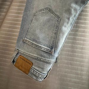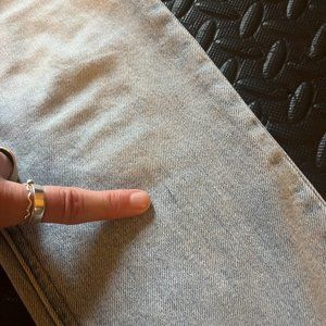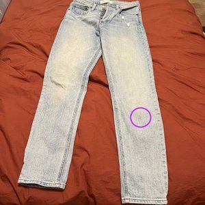 High-rise, light wash, denim in a slim (not skinny) fit. I can't tell if it's pen, or just a slight fabric imperfection, but have pointed it out in the photos, otherwise only worn a few times.