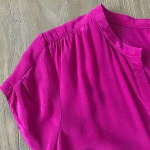 Vibrant fuchsia blouse. Features a V-neck and short sleeves. Perfect for casual or office wear.
