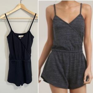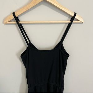 The Farewell Romper from Aritzia by Golden by TNA in black. Spaghetti straps Faux wrap surplice bodice V neck line Stretchy jersey knit material Short length Perfect for casual summer wear or an easy beach cover up! In good overall condition, some slight generalized pilling
