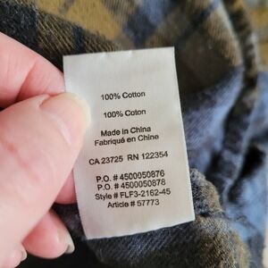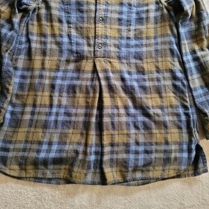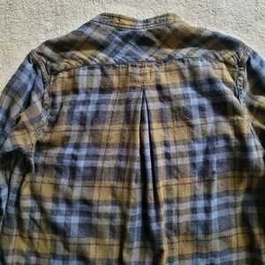 Blue and yellow plaid flannel shirt, 100% cotton, buttons halfway. In good used condition, all over minor pilling.