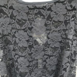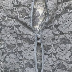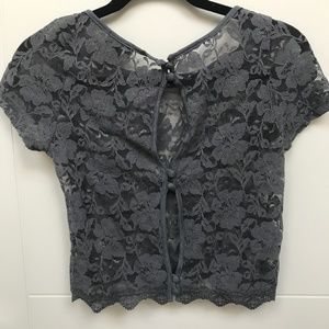 Dillema from Aritzia Lace Sheer Crop Top in a Gray/Blue "Fog" Color. Button-Up/Open Back Detail.