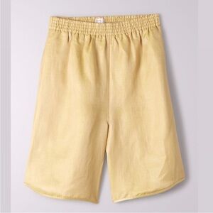 Such cute and comfy shorts. Could definitely dress them up or down. The material is super high quality and elegant. These are long, high-rise shorts with an elastic waistband and rounded hems. They're made from cool, drapey twill with a linen and acetate blend with a rustic texture. They have pockets.