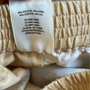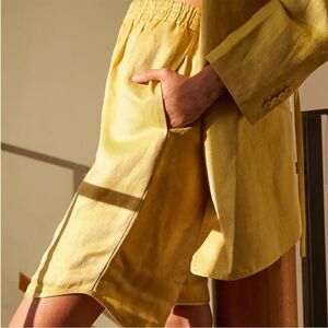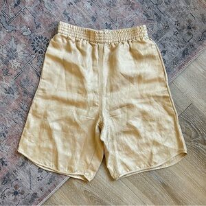 Such cute and comfy shorts. Could definitely dress them up or down. The material is super high quality and elegant. These are long, high-rise shorts with an elastic waistband and rounded hems. They're made from cool, drapey twill with a linen and acetate blend with a rustic texture. They have pockets.