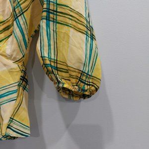 This is a peplum-style blouse with a plunging V-neckline and voluminous dolman sleeves. It's made from drapey, 100% pure silk. This version of the Jazz comes in a hand-painted check design.