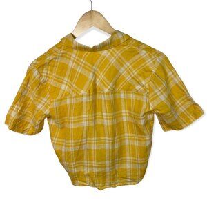 Aritzia Wilfred Free 100% Linen Plaid Crop Short Sleeve Button Down Top. Tie front. Collared. Mustard yellow colour. Women's size XS. Machine washable. Very good pre-loved condition. No visible flaws.