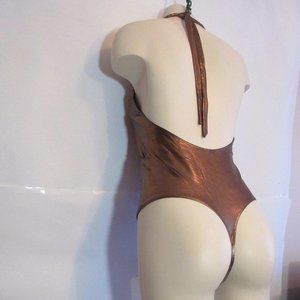 This is a halter bodysuit with a deep V-neckline and an open back. It's made with stretchy, metallic Gold jersey fabric.