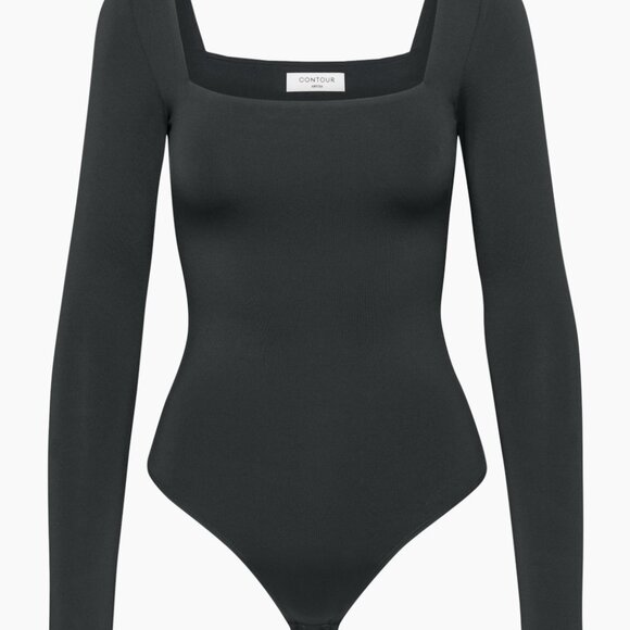 New with tags Aritzia long sleeve, squareneck contour bodysuit in black. This is a MEDIUM TALL bodysuit. Thong-cut buttom with snap closures. Debossed with Aritzia branding. Includes hidden hold loops at shoulder's interior to keep bra strap in place. Please see photos for measurements.
