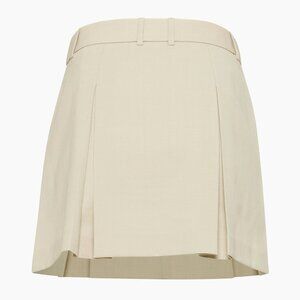 This is a high-waisted mini skirt with front slash pockets and box pleats. It’s made with soft, structured wool gabardine with a twill-like texture