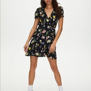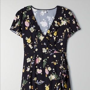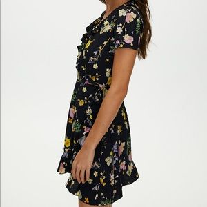 This is a mini wrap-dress with ruffle details and an adjustable fit. It's made with silk-like fabric that drapes beautifully. This version of the Ruffle Wrap Dress has a custom floral print that was designed in-house.