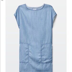 Aritzia Nori Short Shift Dress Sz M Light Denim Chambray Front Pockets Raw Edge