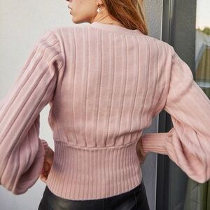 Stylish pink ribbed cardigan. Features deep V-neck and button closure. Perfect for layering.