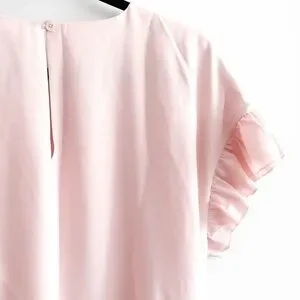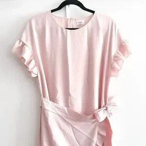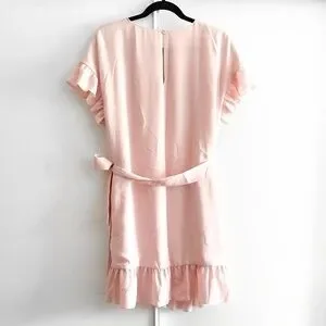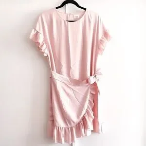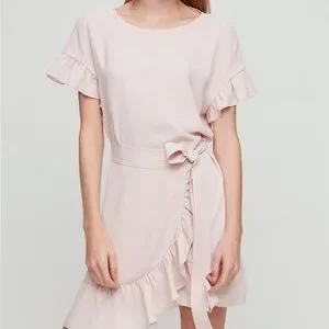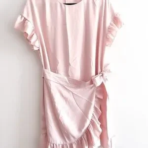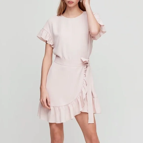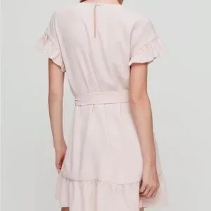 Chic Aritzia mini dress in soft pink. Features ruffle sleeves and hem. Wrap style with tie detail.
