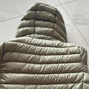 Stylish puffer jacket with a hood. Features a sleek design in a light green color.