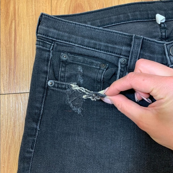 In good condition. The front pocket is a bit torn. Blends in with the distressing. Inner thigh stitching shows signs of wear