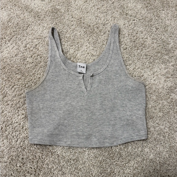 Stylish ribbed crop top by TNA. Soft fabric with a heather gray finish. Ideal for casual wear.