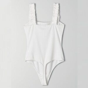 This is a high-stretch, thong-cut bodysuit with a square neckline and ruffle straps